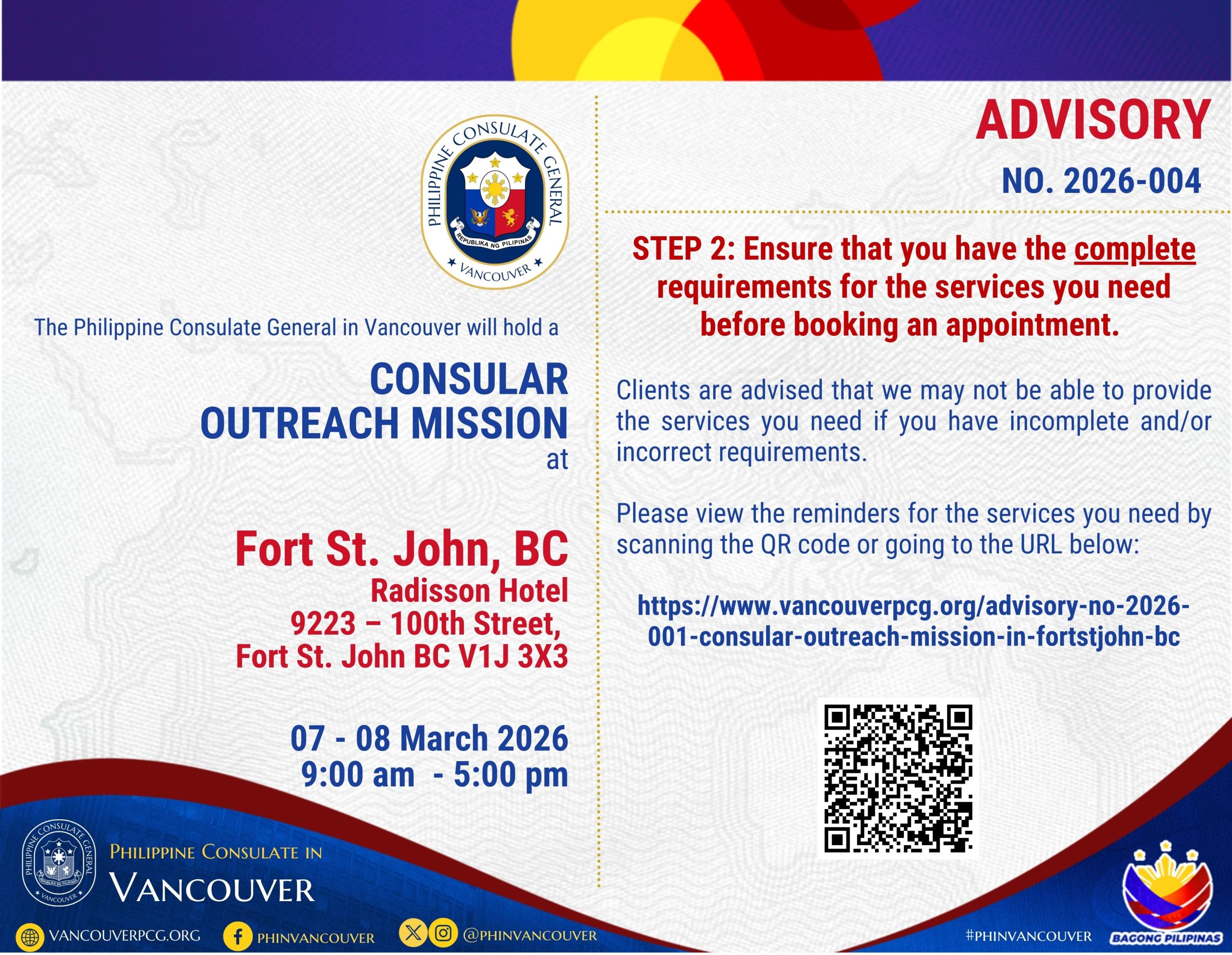 The Philippine Consulate General in Vancouver will hold a CONSULAR OUTREACH MISSION at Fort St. John, BC on 07 – 08 March 2026 from 9:00 am – 5:00 pm.