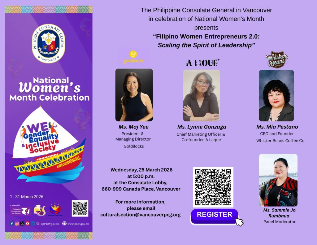 In celebration of the National Women’s Month 2026, the Philippine Consulate General in Vancouver is pleased to invite you to a Talk entitled “Filipino Women Entrepreneurs 2.0 : Scaling the Spirit of Leadership”.