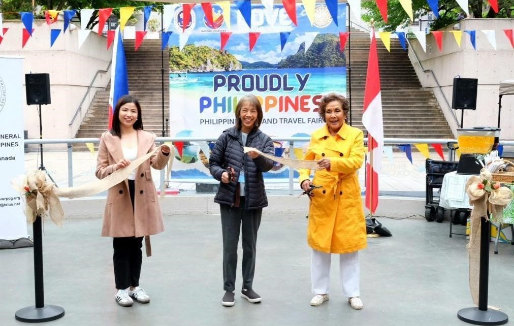 (L-R) Ms. Katrin Erika A. Buted, Department Head of the Provincial Tourism and Cultural Affairs Office of Batangas, Consul General Arlene T. Magno and Hon. Hedy Fry, Member of Parliament and Chair of the Standing Committee on Canadian Heritage, cut the ribbon to officially open Proudly Philippines 2024.
